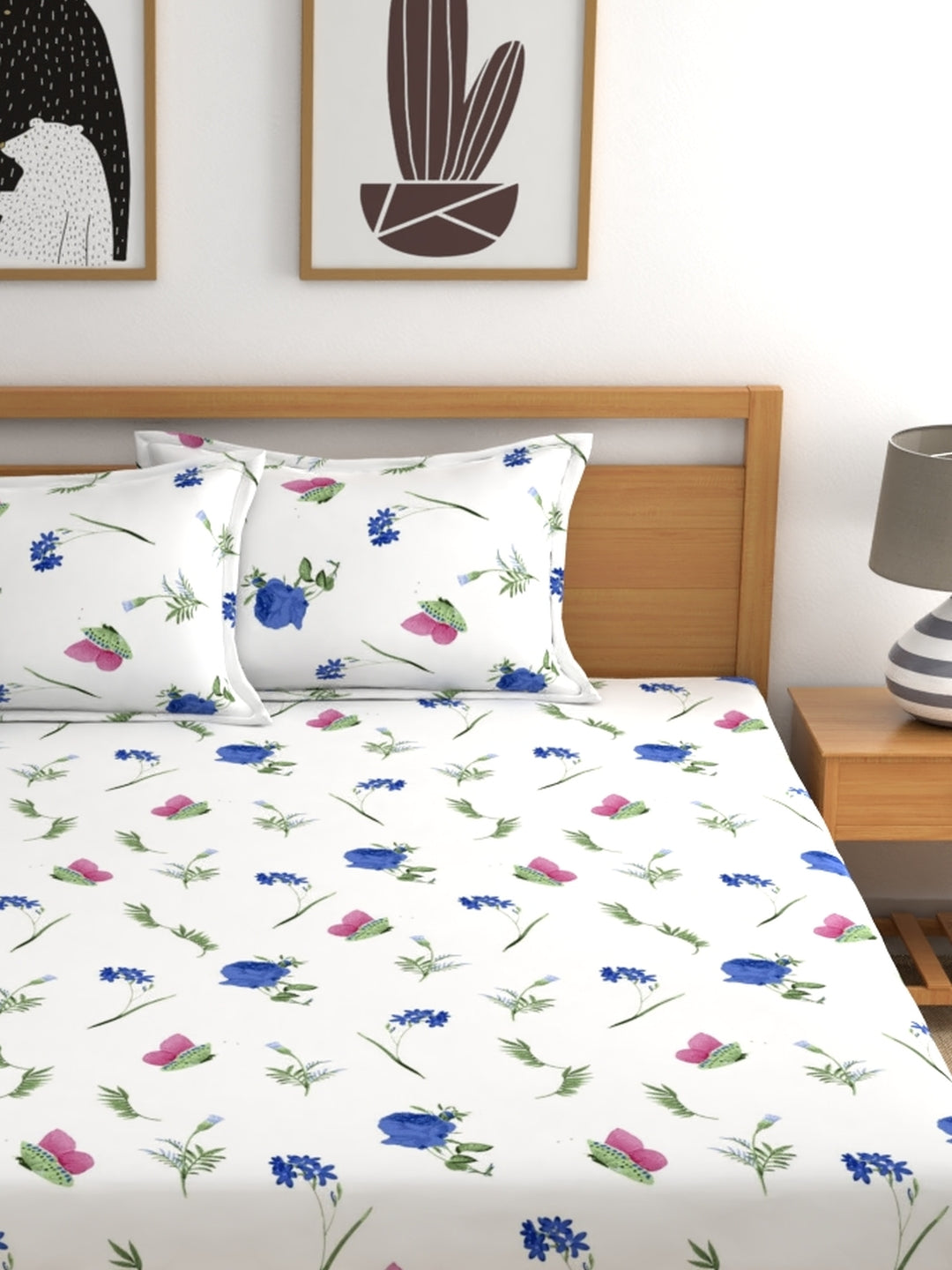 Home Ecstasy 100% Cotton Floral Bedsheet Set | 140 TC | White and Blue