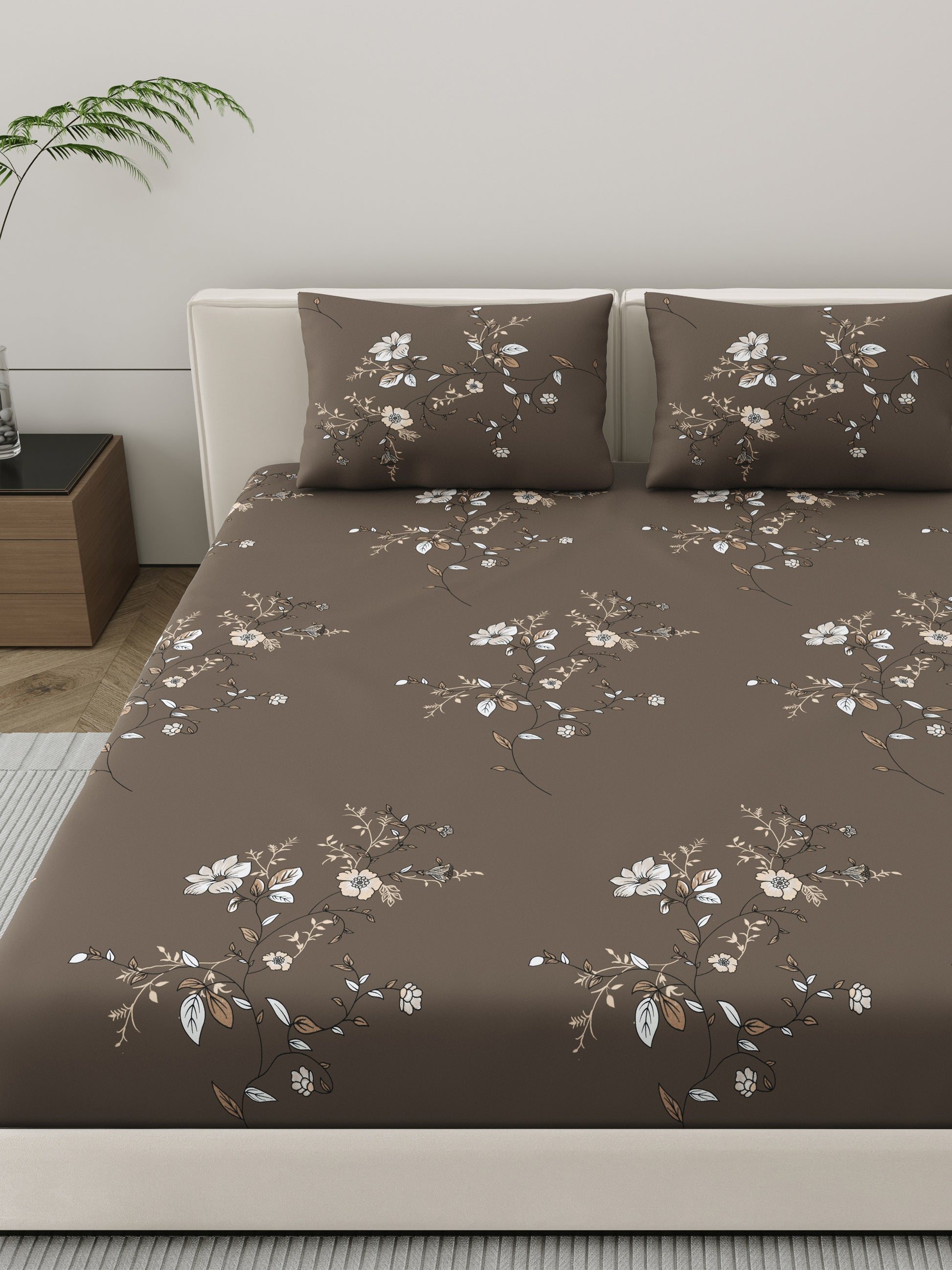 Dreamscape Wrinkle Free Floral Bedsheet Set | 120 GSM | Dark Brown