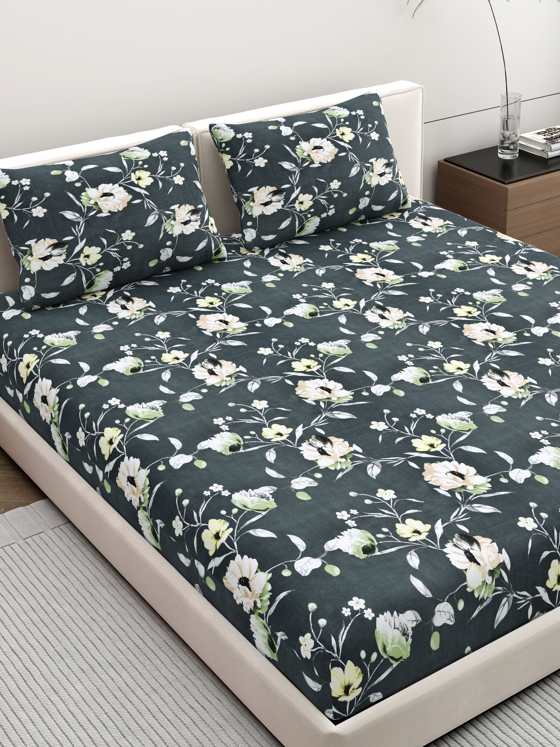 Dreamscape Wrinkle Free Floral Bedsheet Set | 120 GSM | Dark Grey