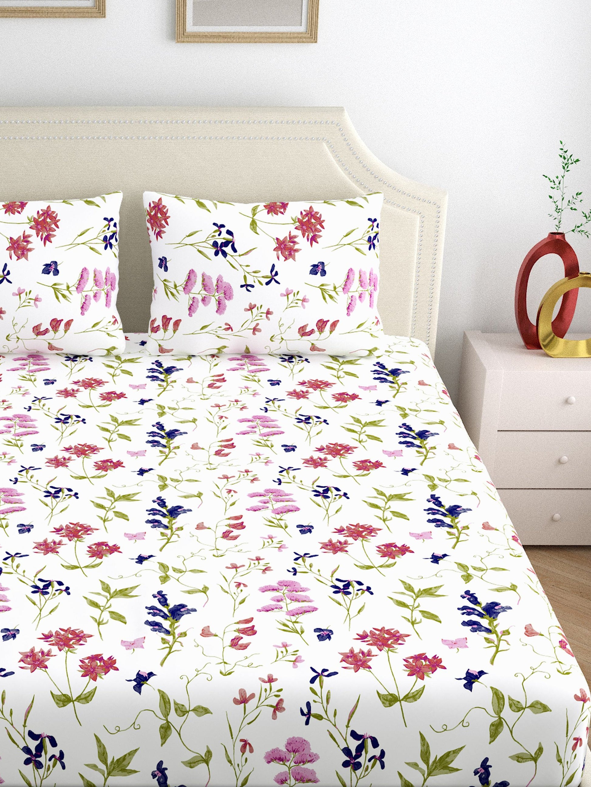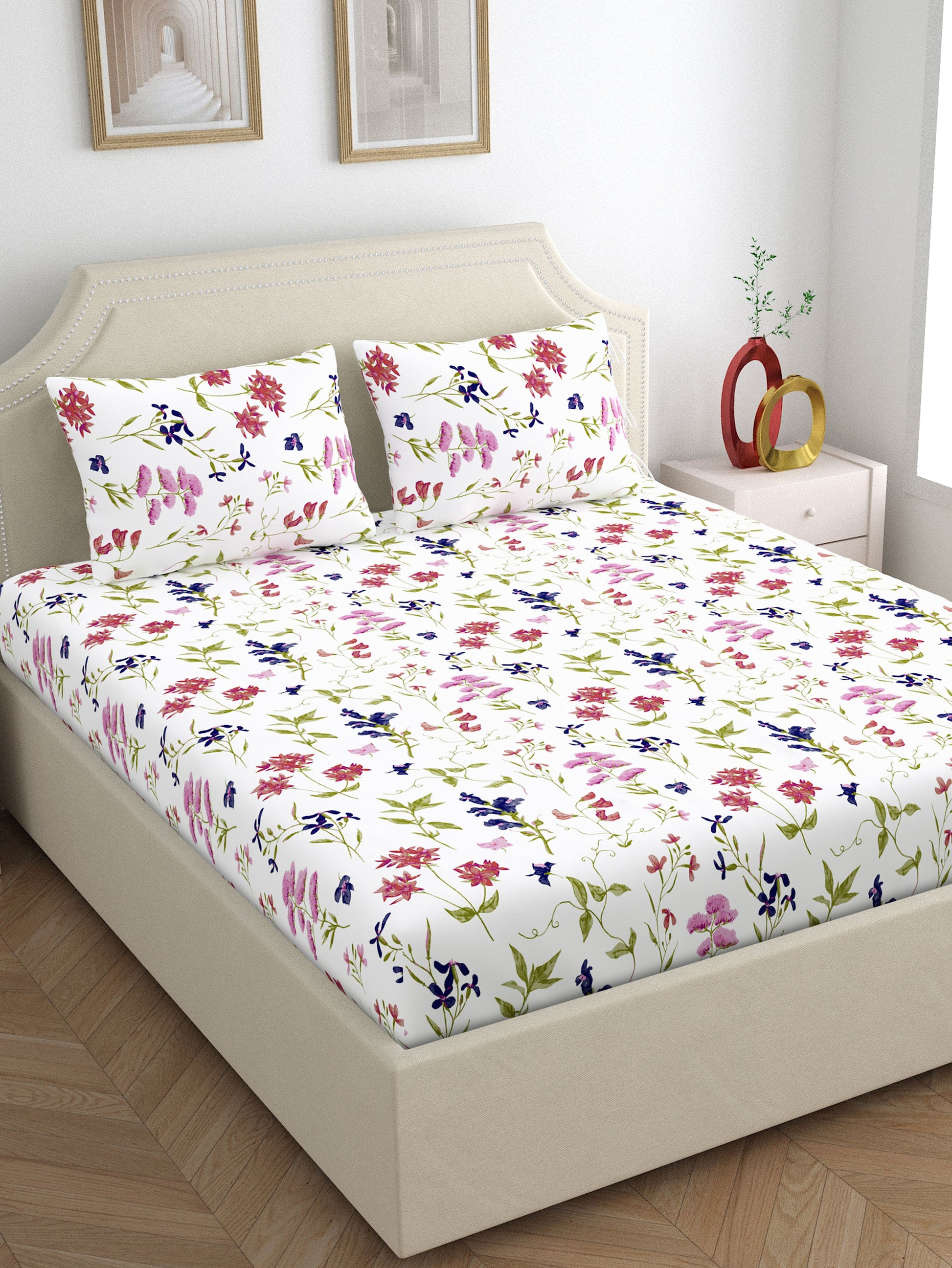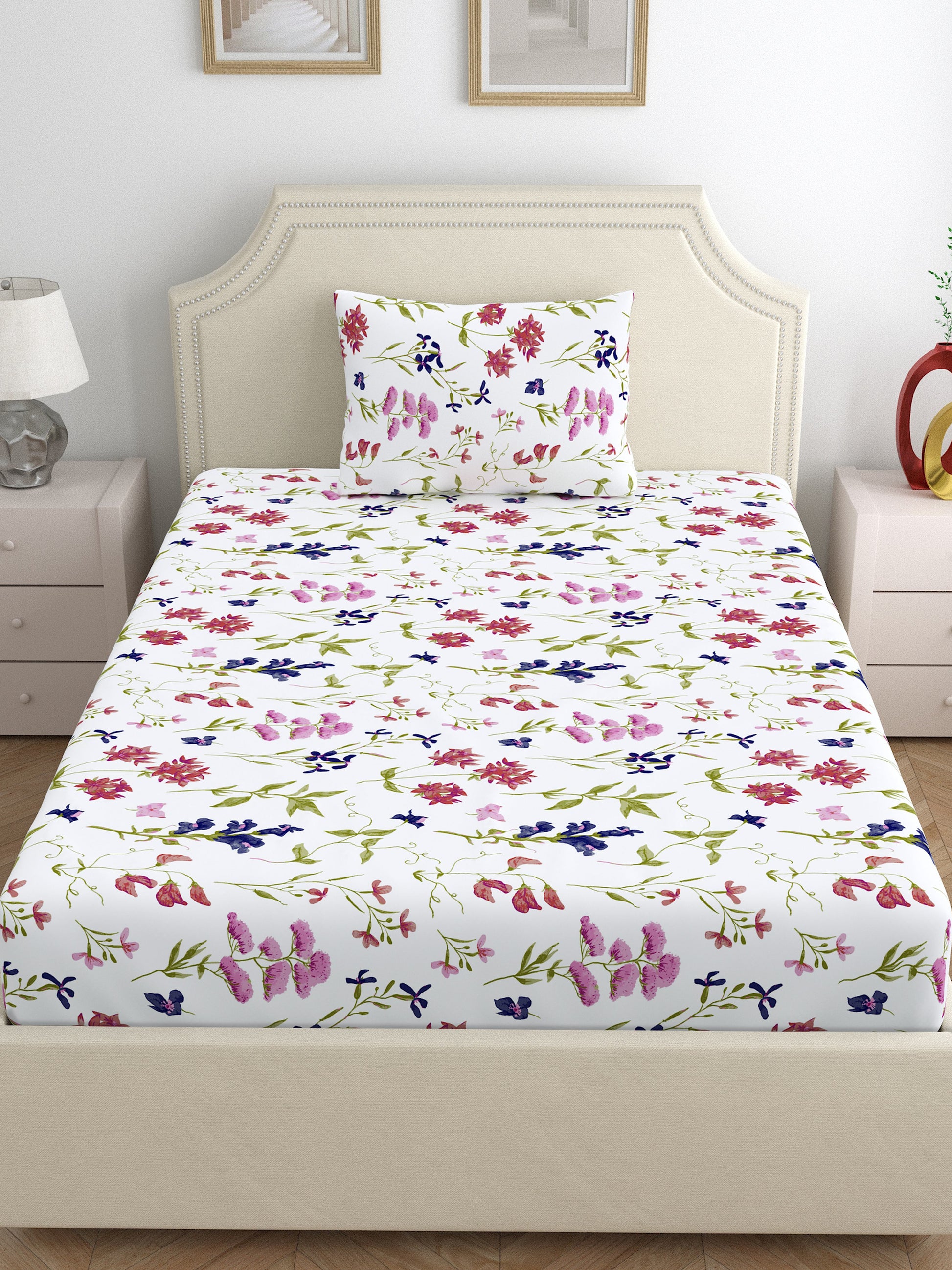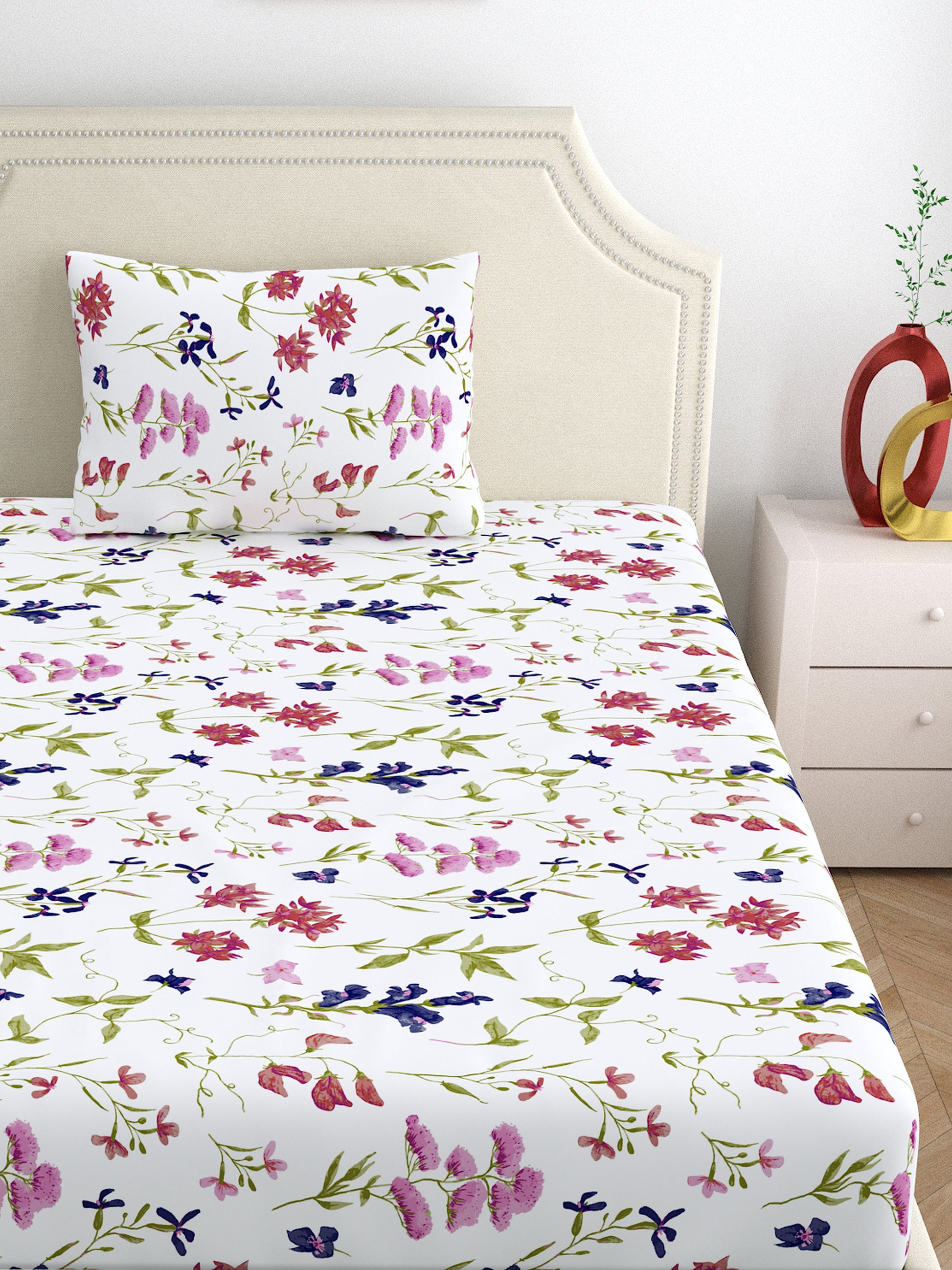 Home Ecstasy 100% Cotton Bedsheets, Floral | 140 TC | White