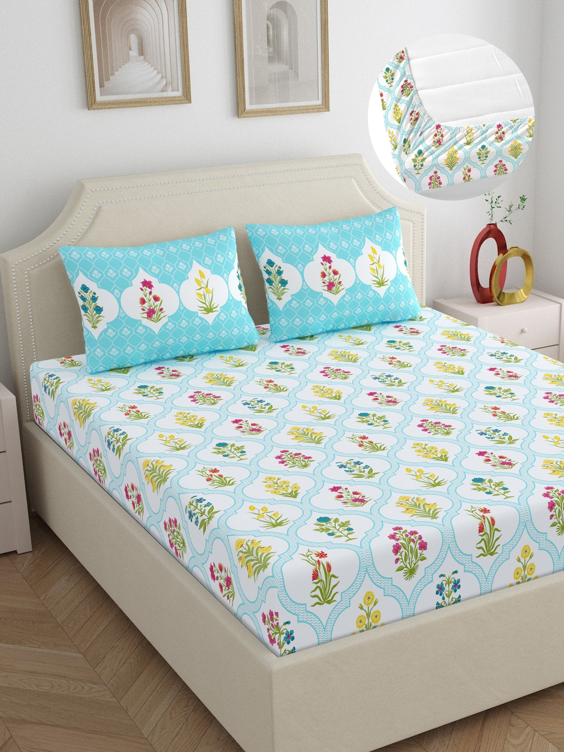 Package content : 1 Double size bedsheet & 2 Pillow Covers