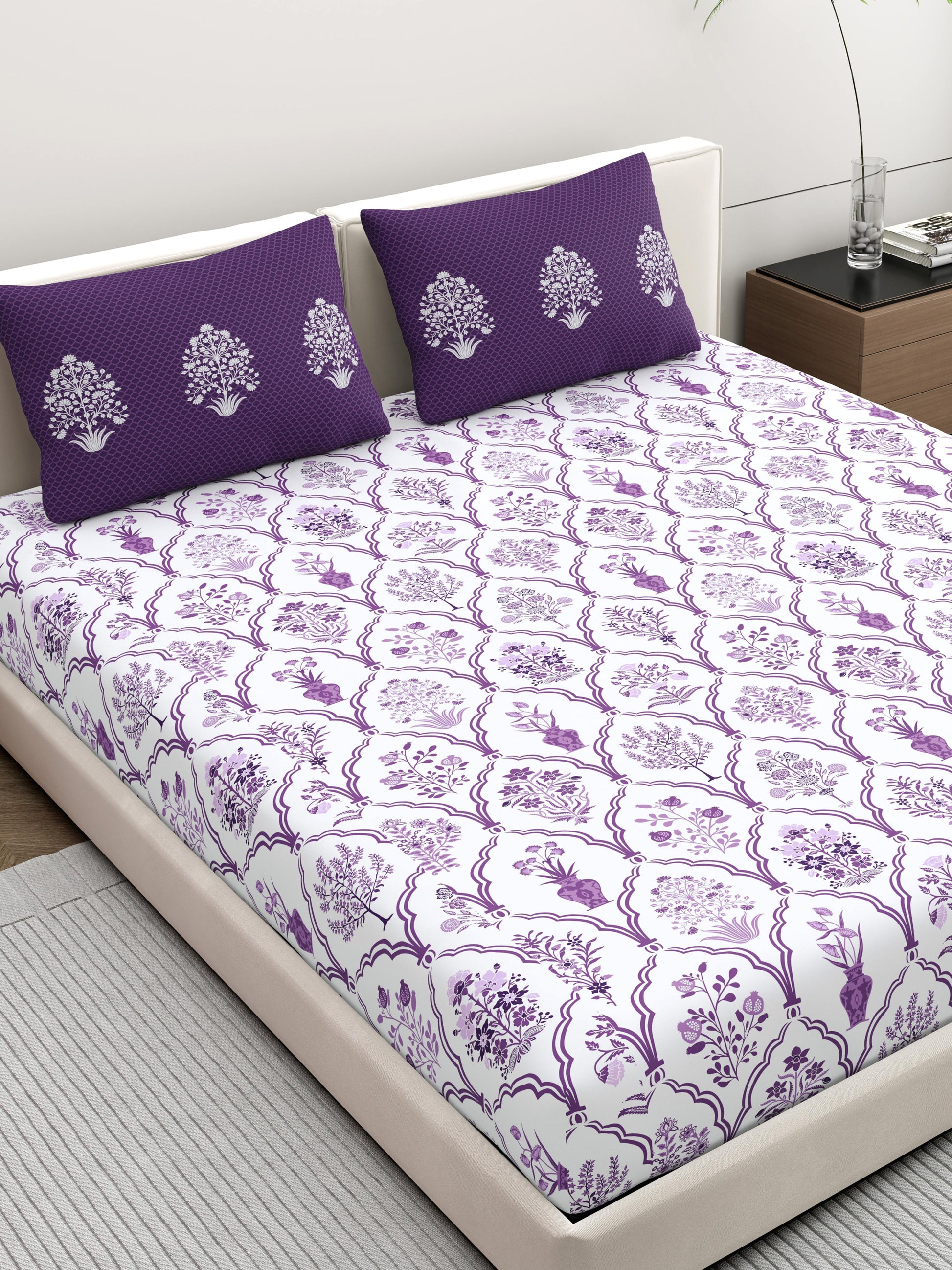 Home Ecstasy 100% Cotton 140 TC Floral Bedsheet Set - Colour: Purple