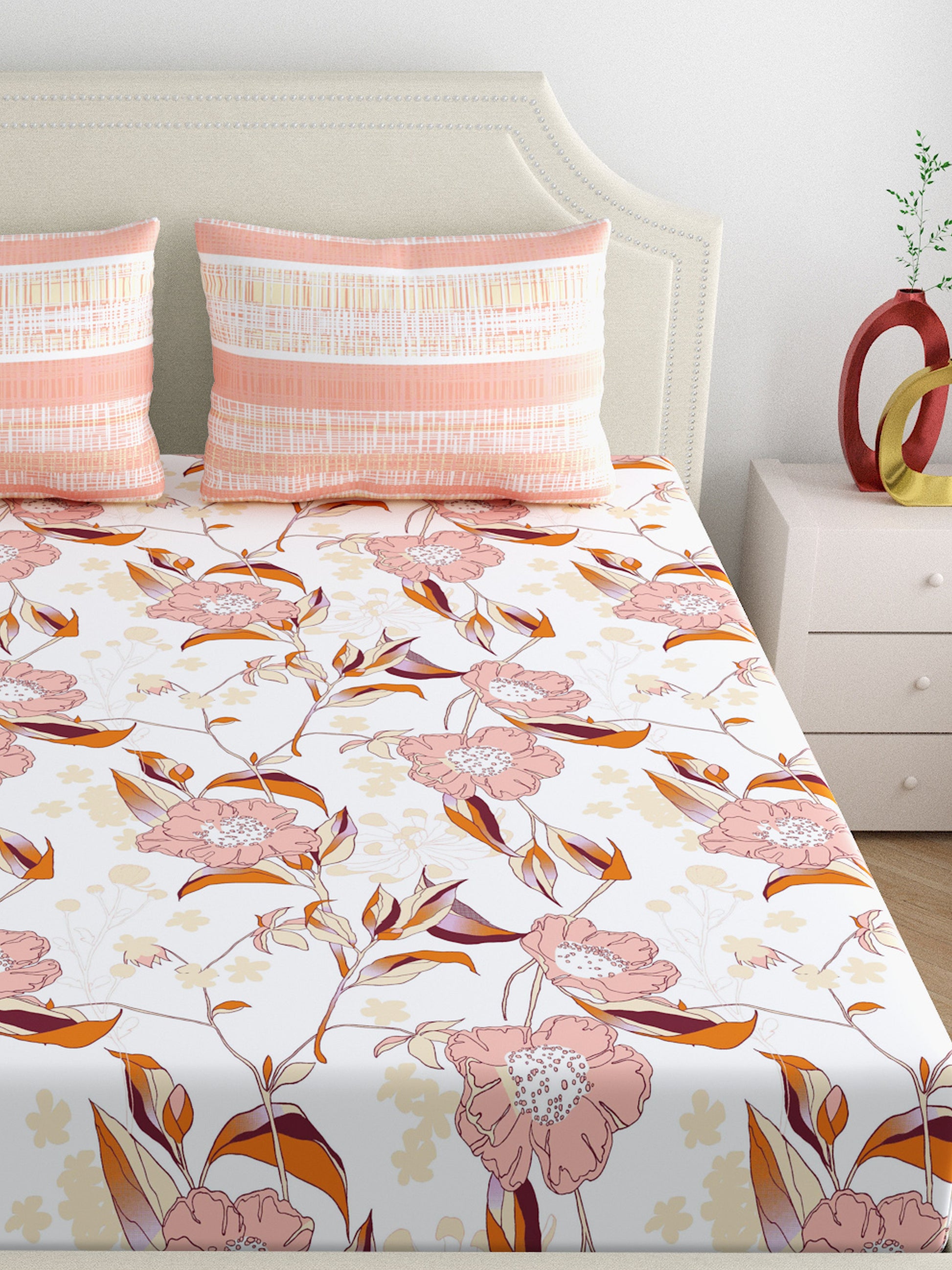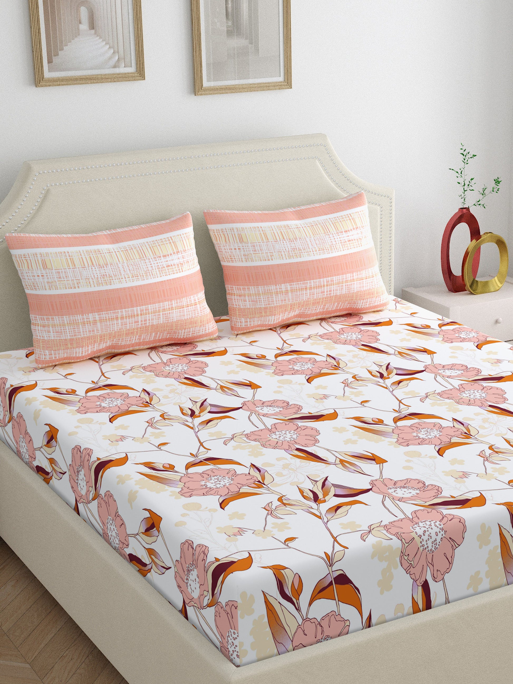 Home Ecstasy 100% Cotton | Floral Bedsheet Set | 140 TC | Beige